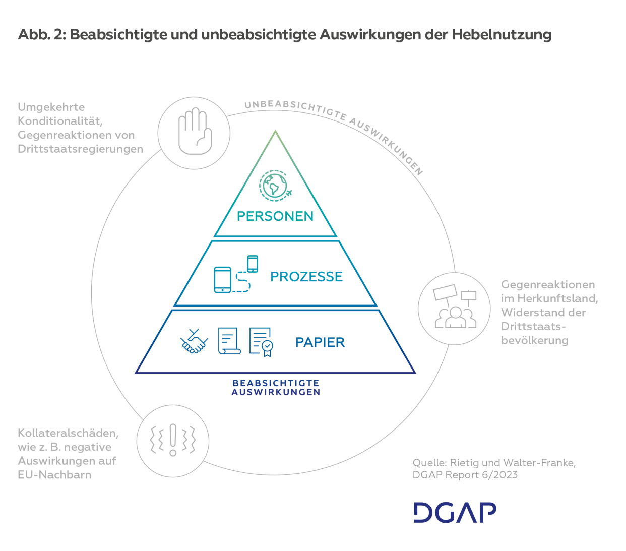 Wenn diese Hebel eingesetzt werden, können sie erwünschte Auswirkungen auf drei Ebenen haben: den Abschluss eines Abkommens, eines gemeinsamen Dokuments oder einer Erklärung (Papier), administrative oder technische Änderungen (Prozess) und Migrationsbewegungen (Personen). Sie bringen aber auch unbeabsichtigte Nebenwirkungen mit sich, wie z. B. Gegenreaktionen von Menschen aus Drittländern oder das Phänomen der umgekehrten Konditionalität, wenn ein Drittland auf Drohungen mit einer Verringerung von Grenzpatrouillen oder der Unterstützung irregulärer Weiterwanderung reagiert. Der Hebeleinsatz eines EU-Landes kann auch die Migrationsbeziehungen seiner EU-Nachbarn zu diesem Drittland verschlechtern.