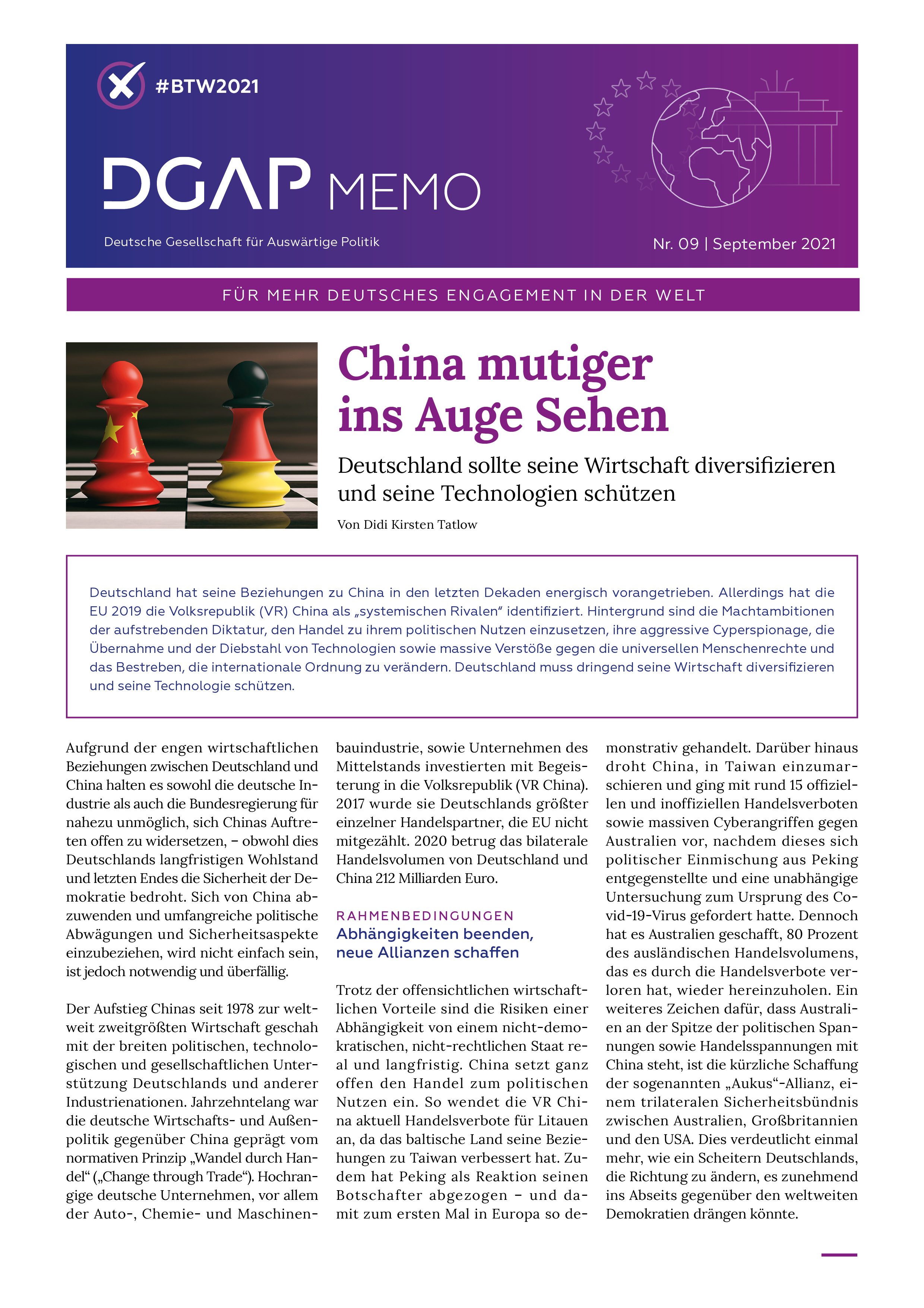 Aufgrund der engen wirtschaftlichen Beziehungen zwischen Deutschland und China halten es sowohl die deutsche Industrie als auch die Bundesregierung für nahezu unmöglich, sich Chinas Auftreten offen zu widersetzen, – obwohl dies Deutschlands langfristigen Wohlstand und letzten Endes die Sicherheit der Demokratie bedroht. Sich von China abzuwenden und umfangreiche politische Abwägungen und Sicherheitsaspekte einzubeziehen, wird nicht einfach sein, ist jedoch notwendig und überfällig.
