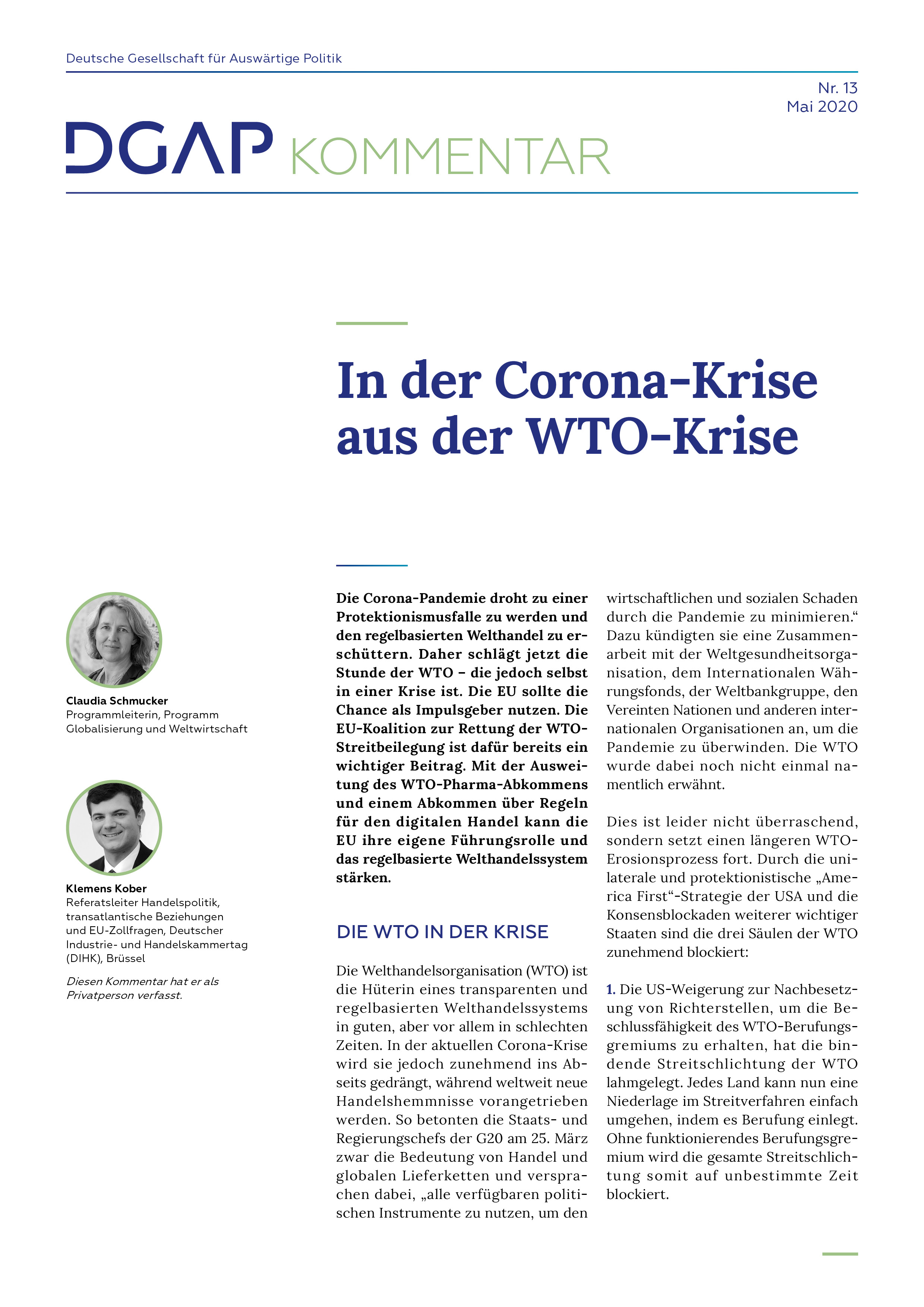 Für Deutschland gilt besonders: Multilateralismus ist im Handel das beste Mittel, um globale Regeln zu vereinbaren, Märkte zu öffnen und Streitigkeiten friedlich beizulegen. Deutschland sollte daher seine erste EU-Ratspräsidentschaft seit über einem Jahrzehnt nutzen, das regelbasierte Handelssystem gegen Protektionismus und Unilateralismus zu verteidigen und eine mutige WTO-Reform mitanzustoßen. Betätigungsfelder gibt es genug. Offener Plurilateralismus, also ein Voranschreiten von willigen Staaten, ohne andere auszugrenzen, ist in Zeiten der Corona-Krise die beste Lösung zur Rettung des Multilateralismus. Hier kann die WTO auch von der Integration der verschiedenen Geschwindigkeiten in der EU lernen. Indem Europa sich für die Rettung der WTO einsetzt, schützt es am Ende auch sich selbst.