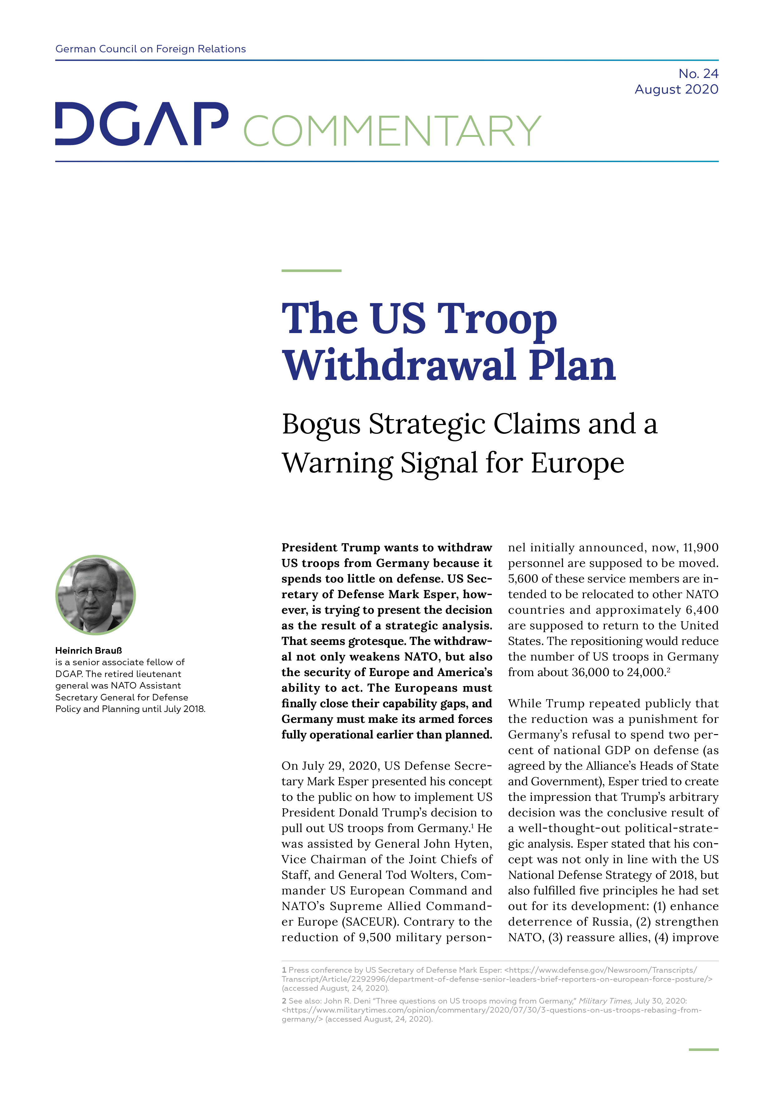Am 29. Juli 2020 präsentierte der amerikanische Verteidigungsminister Mark Esper der Öffentlichkeit sein Konzept, wie die Entscheidung von US-Präsident Donald Trump umgesetzt werden soll, amerikanische Truppen aus Deutschland abzuziehen. Assistiert wurde er dabei durch den Vice Chairman der Joint Chiefs Of Staff, General J. Hyten, und General T. Wolters, Kommandeur der U.S.-Streitkräfte in Europa und militärischer Oberbefehlshaber der NATO. Entgegen dem ursprünglich verbreiteten Reduzierungsumfang von 9.500 Soldatinnen und Soldaten sollen nun 11.900 verlegt werden, davon 5.600 in andere NATO-Länder und 6.400 zurück in die USA. Die US-Truppenstärke in Deutschland würde von rund 36.000 auf 24.000 Soldaten absinken.