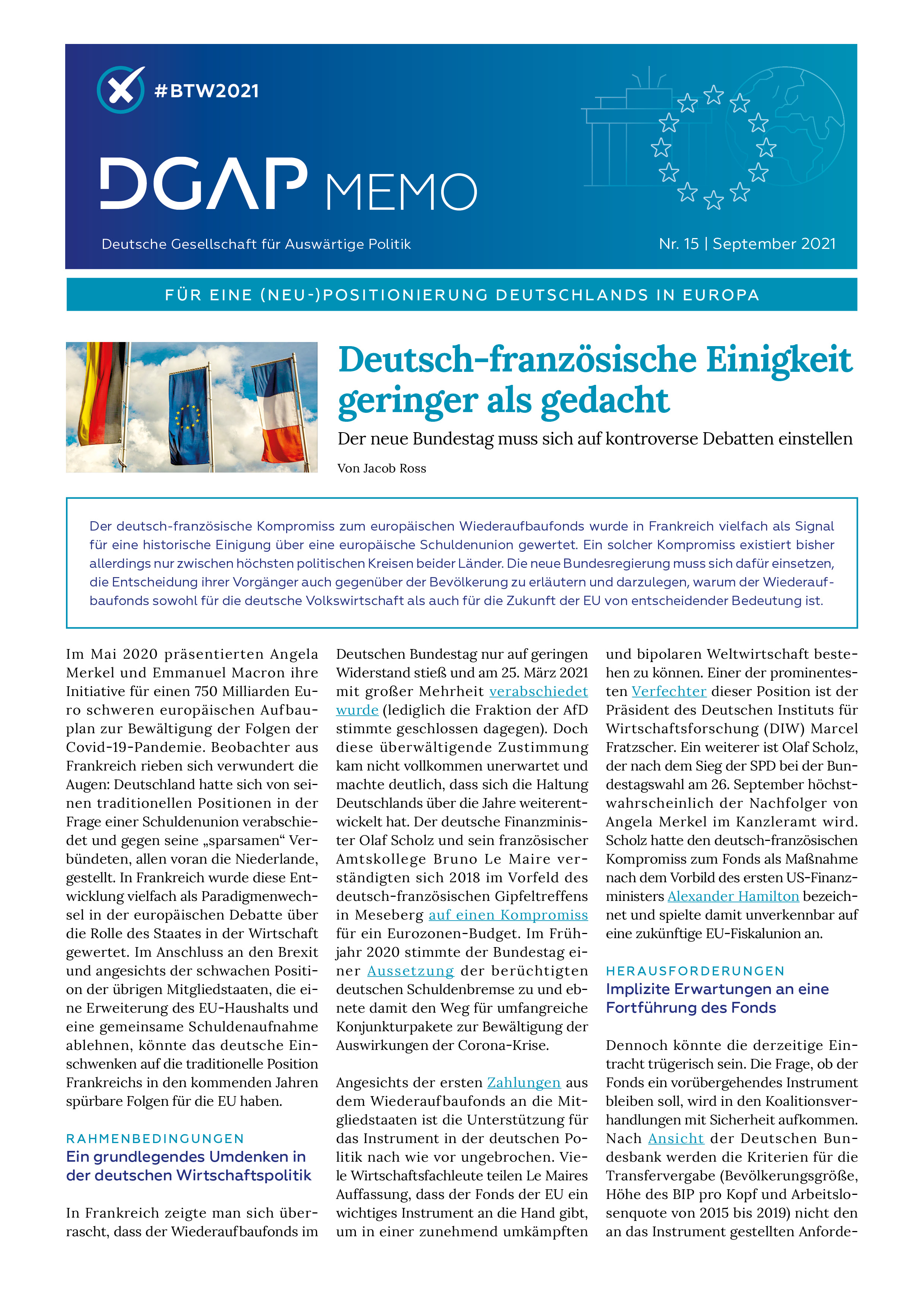 Im August 2021 betonte Shahin Vallée, Programmleiter Geoökonomie bei der DGAP, dass die Parteien die Frage der wirtschaftlichen Zukunft der EU im Wahlkampf ausgespart hätten. Tatsächlich sind nur wenige Deutsche mit dem EU-Wiederaufbaufonds und den möglichen weitreichenden Folgen seiner Fortführung für die Zukunft der Europäischen Union vertraut.