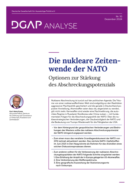 Somit hat die NATO in den vergangenen Jahren zwar einige Verbesserungen bei der nuklearen „Hardware“ und bei den entsprechenden Verfahren vorgenommen. Was allerdings nach wie vor fehlt, ist die nuklearstrategische „Software“, also ein politisch-strategisches Grundlagendokument, das einen Konsens in der NATO über den Zweck der nuklearen Abschreckung in der Post-2022-Ära festschreibt und damit das vorhandene Waffenpotenzial in einen Bezug zum Zweck setzt. Nur auf der Basis eines solchen Konsensdokuments ließe sich die künftige Größe und Ausgestaltung des NATO-Nuklearpotenzials bestimmen.