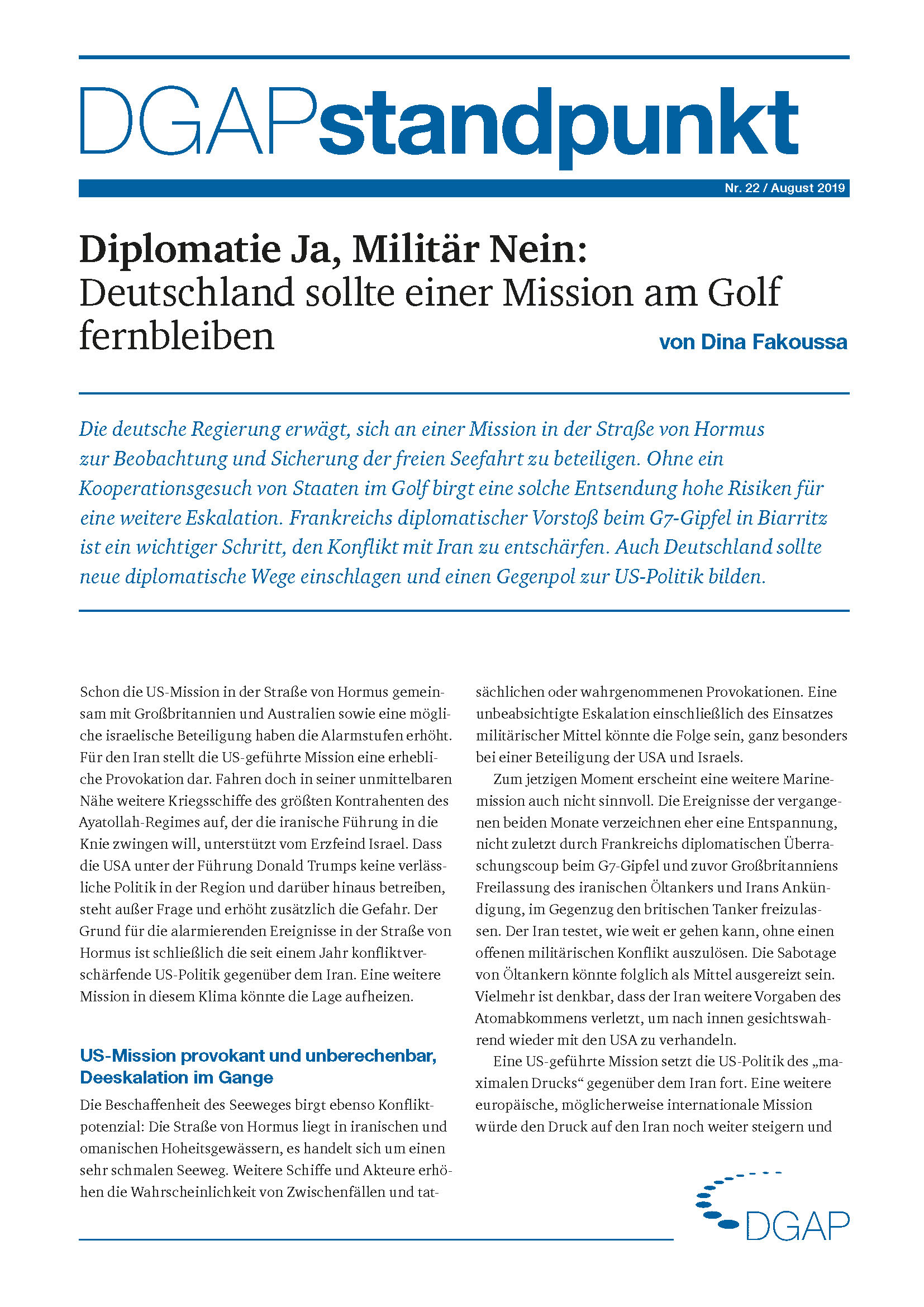 Die deutsche Regierung erwägt, sich an einer Mission in der Straße von Hormus zur Beobachtung und Sicherung der freien Seefahrt zu beteiligen. Ohne ein Kooperationsgesuch von Staaten im Golf birgt eine solche Entsendung hohe Risiken für eine weitere Eskalation. Frankreichs diplomatischer Vorstoß beim G7-Gipfel in Biarritz ist ein wichtiger Schritt, den Konflikt mit Iran zu entschärfen. Auch Deutschland sollte neue diplomatische Wege einschlagen und einen Gegenpol zur US-Politik bilden.