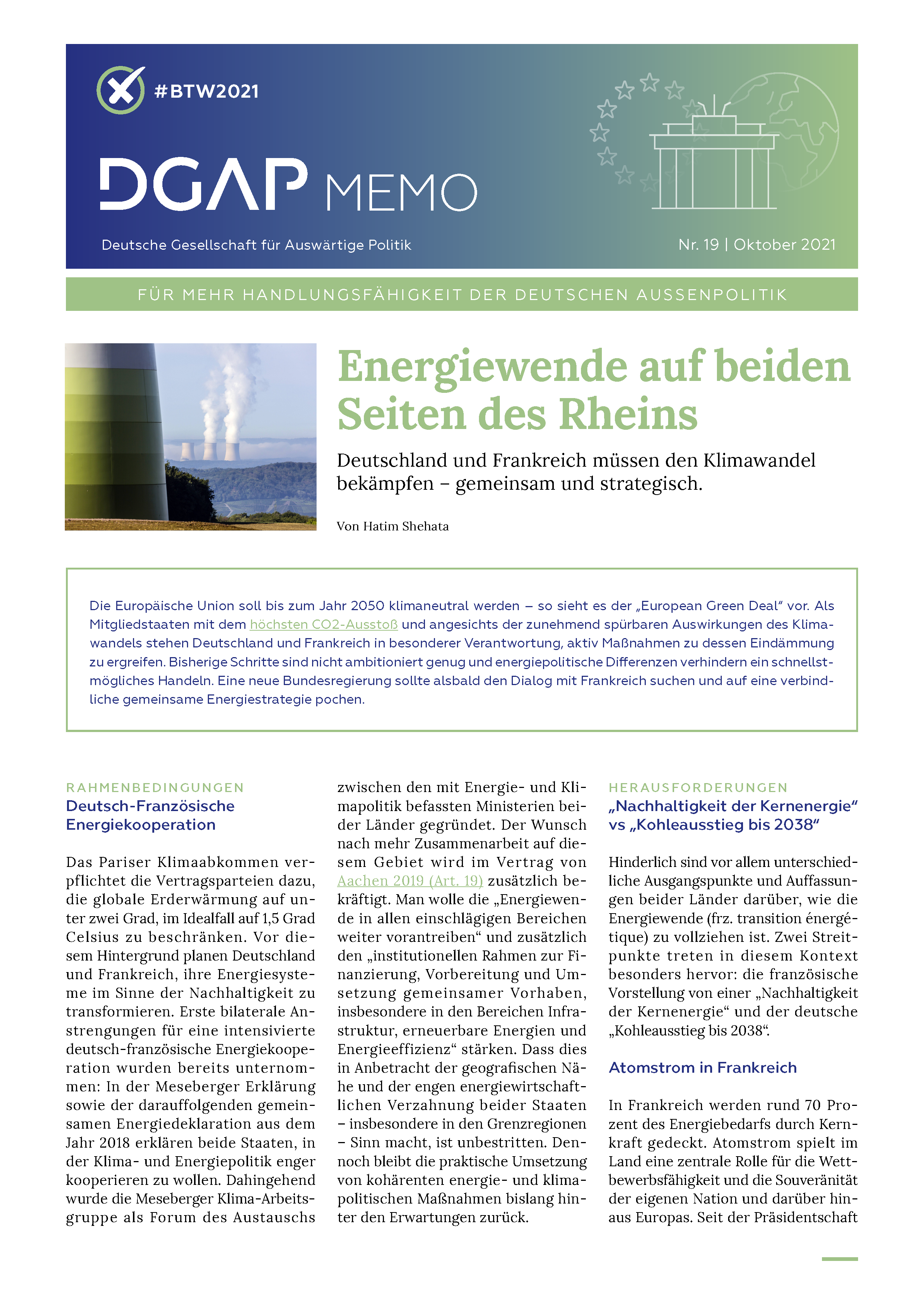 Das Pariser Klimaabkommen verpflichtet die Vertragsparteien dazu, die globale Erderwärmung auf unter zwei Grad, im Idealfall auf 1,5 Grad Celsius zu beschränken. Vor diesem Hintergrund planen Deutschland und Frankreich, ihre Energiesysteme im Sinne der Nachhaltigkeit zu transformieren. Erste bilaterale Anstrengungen für eine intensivierte deutsch-französische Energiekooperation wurden bereits unternommen: In der Meseberger Erklärung sowie der darauffolgenden gemeinsamen Energiedeklaration aus dem Jahr 2018 erklären beide Staaten, in der Klima- und Energiepolitik enger kooperieren zu wollen. Dahingehend wurde die Meseberger Klima-Arbeitsgruppe als Forum des Austauschs zwischen den mit Energie- und Klimapolitik befassten Ministerien beider Länder gegründet. Der Wunsch nach mehr Zusammenarbeit auf diesem Gebiet wird im Vertrag von Aachen 2019 (Art. 19) zusätzlich bekräftigt. Man wolle die „Energiewende in allen einschlägigen Bereichen weiter vorantreiben“ und zusätzlich den „institutionellen Rahmen zur Finanzierung, Vorbereitung und Umsetzung gemeinsamer Vorhaben, insbesondere in den Bereichen Infrastruktur, erneuerbare Energien und Energieeffizienz“ stärken. Dass dies in Anbetracht der geografischen Nähe und der engen energiewirtschaftlichen Verzahnung beider Staaten – insbesondere in den Grenzregionen – Sinn ergibt, ist unbestritten. Dennoch bleibt die praktische Umsetzung von kohärenten energie- und klimapolitischen Maßnahmen bislang hinter den Erwartungen zurück.