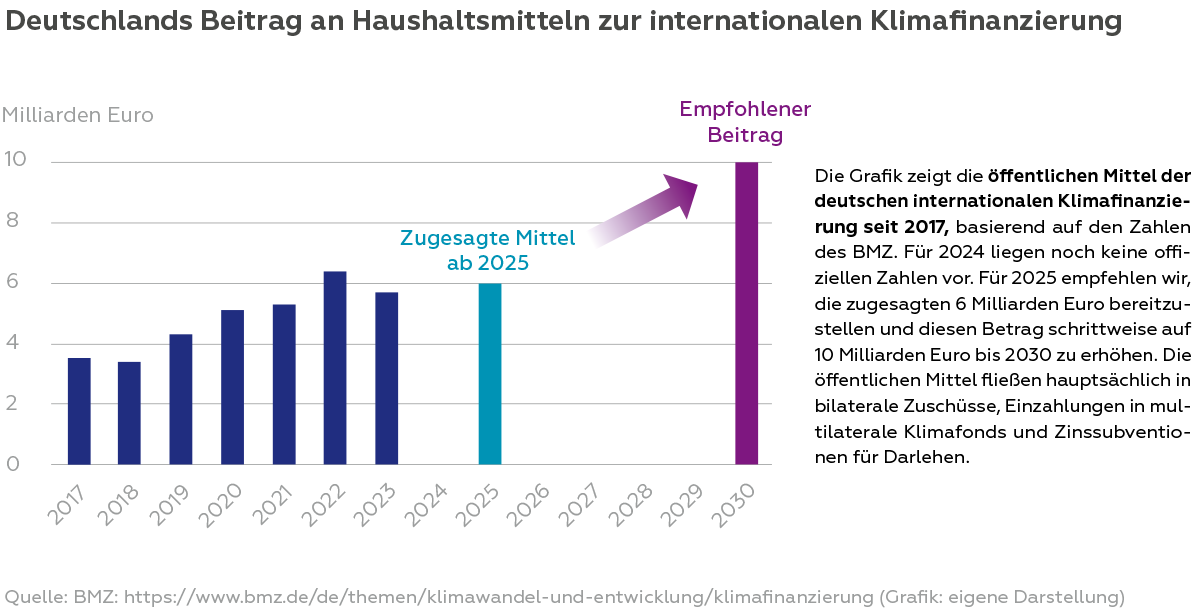 Aus oben genannten Gründen ist Klimafinanzierung somit zentral für die deutsche Wirtschafts-, Außen- und Sicherheitspolitik. Neben den notwendigen inländischen Investitionen im Bereich der Nachhaltigkeitstransformation braucht Deutschland Partner, um Klimaschäden vorzubeugen. Aber auch die Ermöglichung einer Anpassung an den Klimawandel ist wichtig für die internationalen Lieferketten. 2023 leistete Deutschland einen Beitrag von 5,7 Milliarden Euro aus öffentlichen Mitteln, wozu sowohl Zuschüsse als auch Kredite zählen. Im Jahr 2023 waren in der bilateralen Klimafinanzierung Deutschlands weniger als die Hälfte (42%) Zuschüsse. Zudem könnte die Bundesregierung ihr Ziel verfehlen, ab 2025 mindestens 6 Milliarden Euro bereitzustellen.