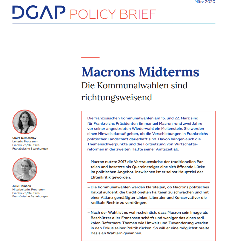 Emmanuel Macrons Partei La République en Marche (LREM) mag zwar die Mehrheit in der Nationalversammlung (Assemblée nationale) stellen und zweitstärkste französische Partei im Europaparlament sein, ist bislang aber noch nicht bei Kommunal- und Regionalwahlen angetreten. Gerade diese sind aber notwendig, um sich in der politischen Landschaft des Landes zu verankern. Eine Wahlniederlage muss Macron vermeiden, um seine Dynamik als Reformer wieder zurückzuerlangen: Immer noch lehnt eine Mehrheit der Franzosen die aktuell debattierte Rentenreform als Herzstück von Macrons Reformagenda ab; seine Zustimmungswerte sind niedrig.