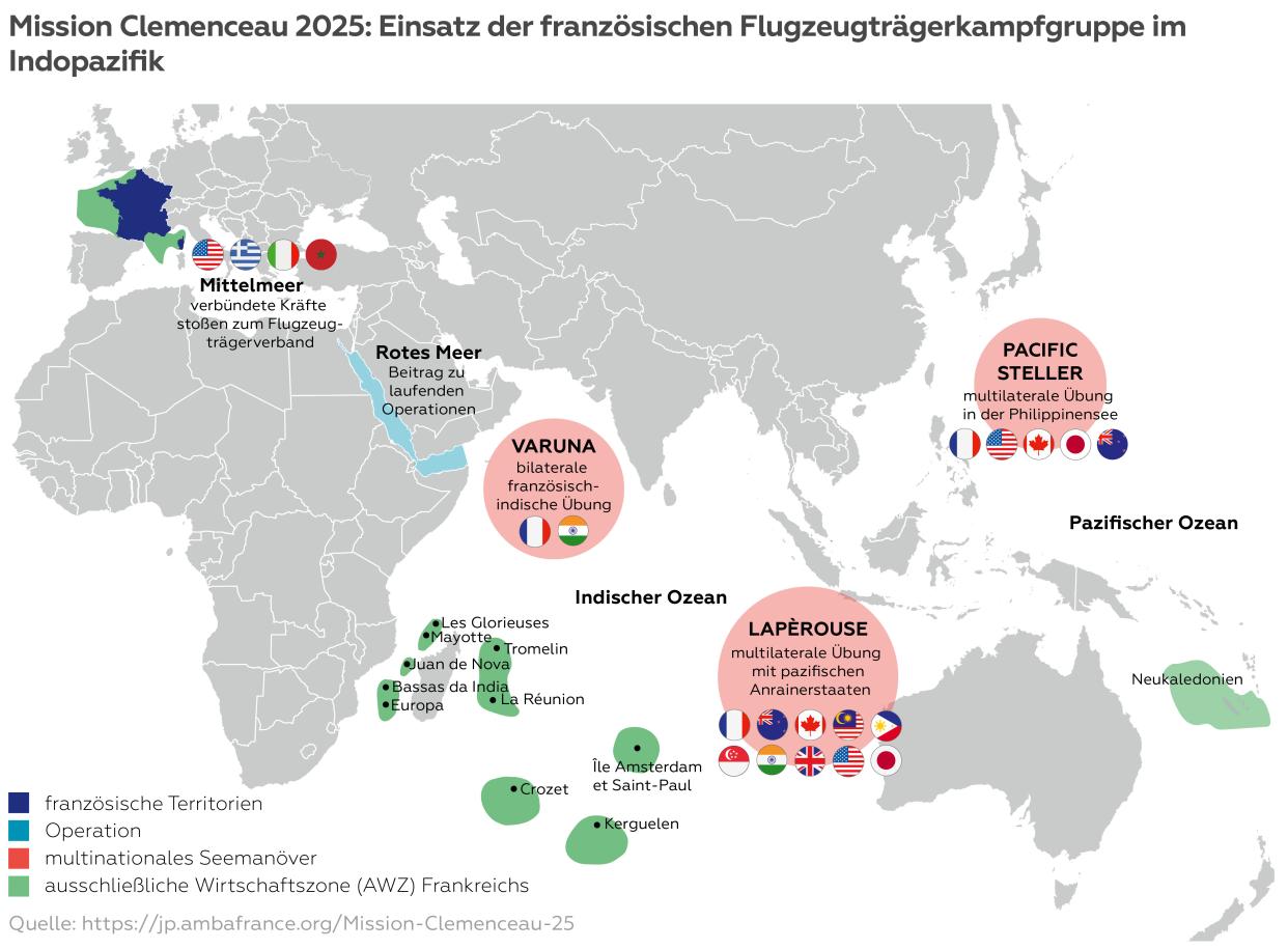 Im April 2025 kehrte die Charles de Gaulle von einer mehrmonatigen Mission zurück. Der Flugzeugträger und sein Verband hatten vor allem im Indo-Pazifik operiert, machten dort in mehreren Partnerländern Station. Sechs Monate lang hatte die französische Marine im Rahmen der Mission „Clemenceau 25“ vier politisch definierte strategische Ziele verfolgt: