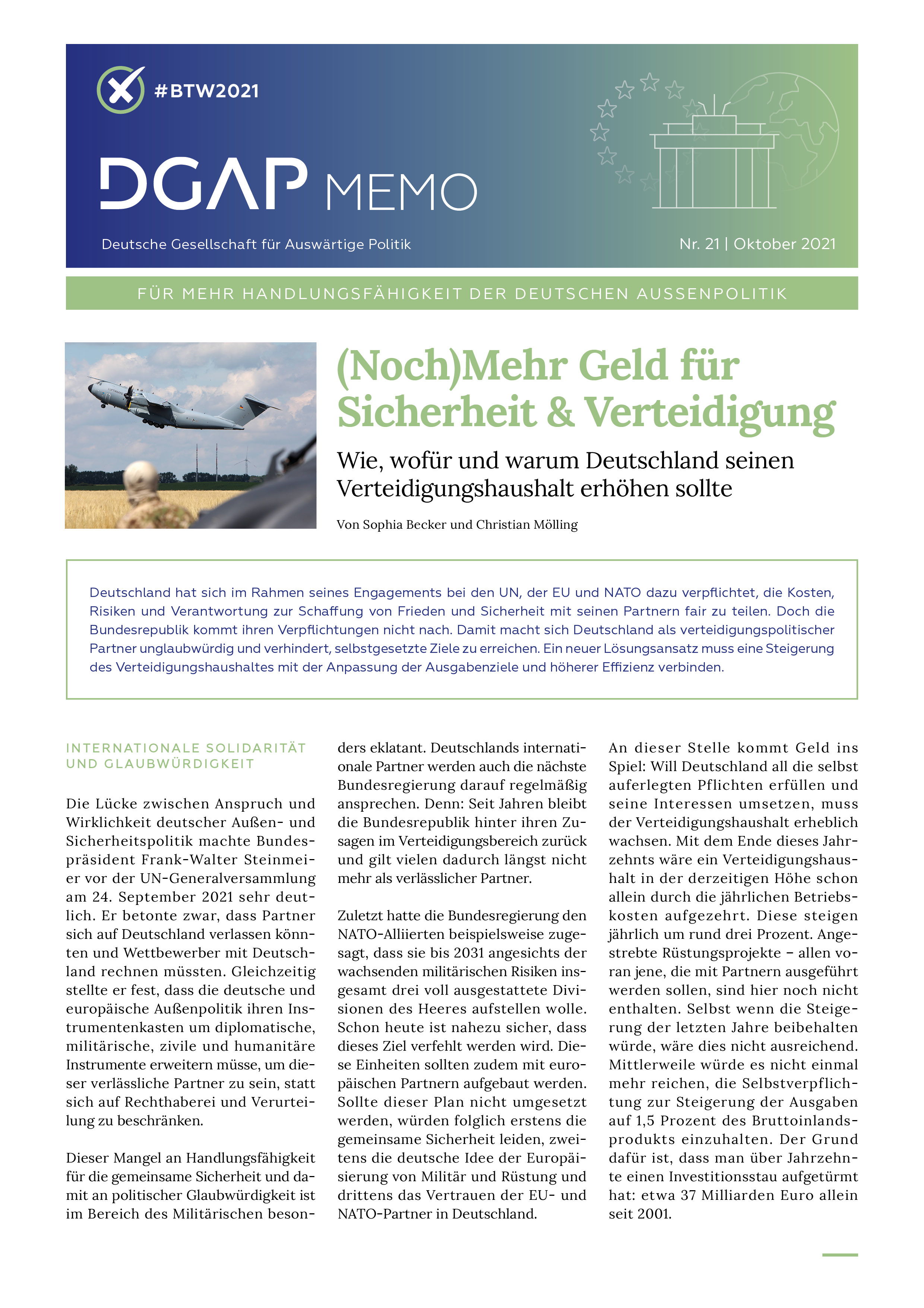 Im Nordatlantikvertrag versichern sich die Mitgliedstaaten der NATO nicht nur gegenseitig Beistand im Falle eines bewaffneten Angriffs, sondern bekennen sich zum gemeinsamen Erhalt von Frieden und Sicherheit. Darauf basierend verpflichten sich die Mitgliedstaaten, die Lasten der Kosten, Risiken und Verantwortung der gemeinsamen Verteidigung zu teilen. Seit dem NATO-Gipfel in Wales 2014 bekannte sich die Bundesrepublik wiederholt zum Zwei-Prozent-Ziel, sprich dazu, zwei Prozent des Bruttoinlandsprodukts für Verteidigung auszugeben. Doch bislang bleibt sie weit hinter dieser Ambition zurück.