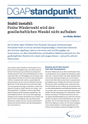 Seit 18 Jahren regiert Wladimir Putin Russland, was es de facto für ihn unmöglich macht, sich selbst weiter als Vertreter für Erneuerung und Wandel zu präsentieren. Deshalb inszeniert Putin sich als Stabilitätsanker in einer chaotischen Welt, als Führungsfigur, die den Russen nach außen globales Prestige und nach innen Berechenbarkeit vorführt. Ironischerweise verliert er gerade dabei die junge Generation, die nur Putin als nationale Führungsfigur kennt. Für die Generation Putin sind nicht Fragen von internationalem Prestige entscheidend, sondern ihre Zukunft in Russland. Alexei Nawalny, der einzige – aber nicht zugelassene – Kandidat mit einem echten Wahlkampf, hat genau diese Generation angesprochen. Für Deutschland und die EU wird es Zeit, eine langfristige Strategie für die russische Gesellschaft zu entwickeln, die nicht auf Putin als Stabilisator oder eine liberale Minderheit setzt, sondern auf eine russische Gesellschaft im Wandel, die patriotisch denkt, aber gleichzeitig globalisiert und vernetzt ist.