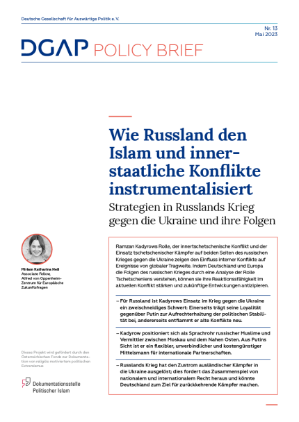 Zusammenfassend kann also gesagt werden, dass durch eine Analyse der genannten Kriegsfaktoren in puncto Tschetschenien – der Rolle Kadyrows, des innertschetschenischen Konflikts, des Engagements tschetschenischer Kämpfer auf beiden Seiten des Kriegs in der Ukraine – politische Verantwortliche in Europa wichtige Einsichten gewinnen können. Darunter etwa, wie Russland internationale Bündnisse mit Regimen im Nahen Osten schmieden will, indem es ideologische Nähe zu diesen Staaten demonstriert. Zudem erhalten sie Erkenntnisse darüber, mit welchen unvorhergesehenen oder unterschätzten Herausforderungen die russische Führung konfrontiert ist.