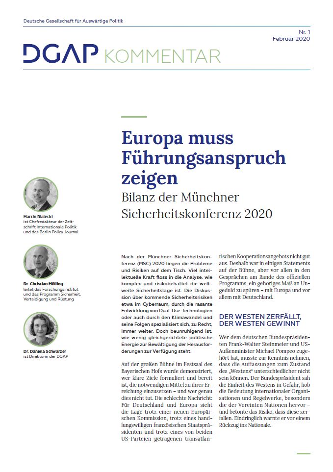 In terms of German and European foreign policy, the conclusions of the MSC 2020 are sobering. Anyone who fails to formulate clear goals other than the desire to adhere to the “old order” has no credible claim to leadership. Adhering to the values and principles of this old order seems to be normatively correct. Nevertheless, it is important not to miss connecting it to a “new order” – and the opportunity to help shape this new order.