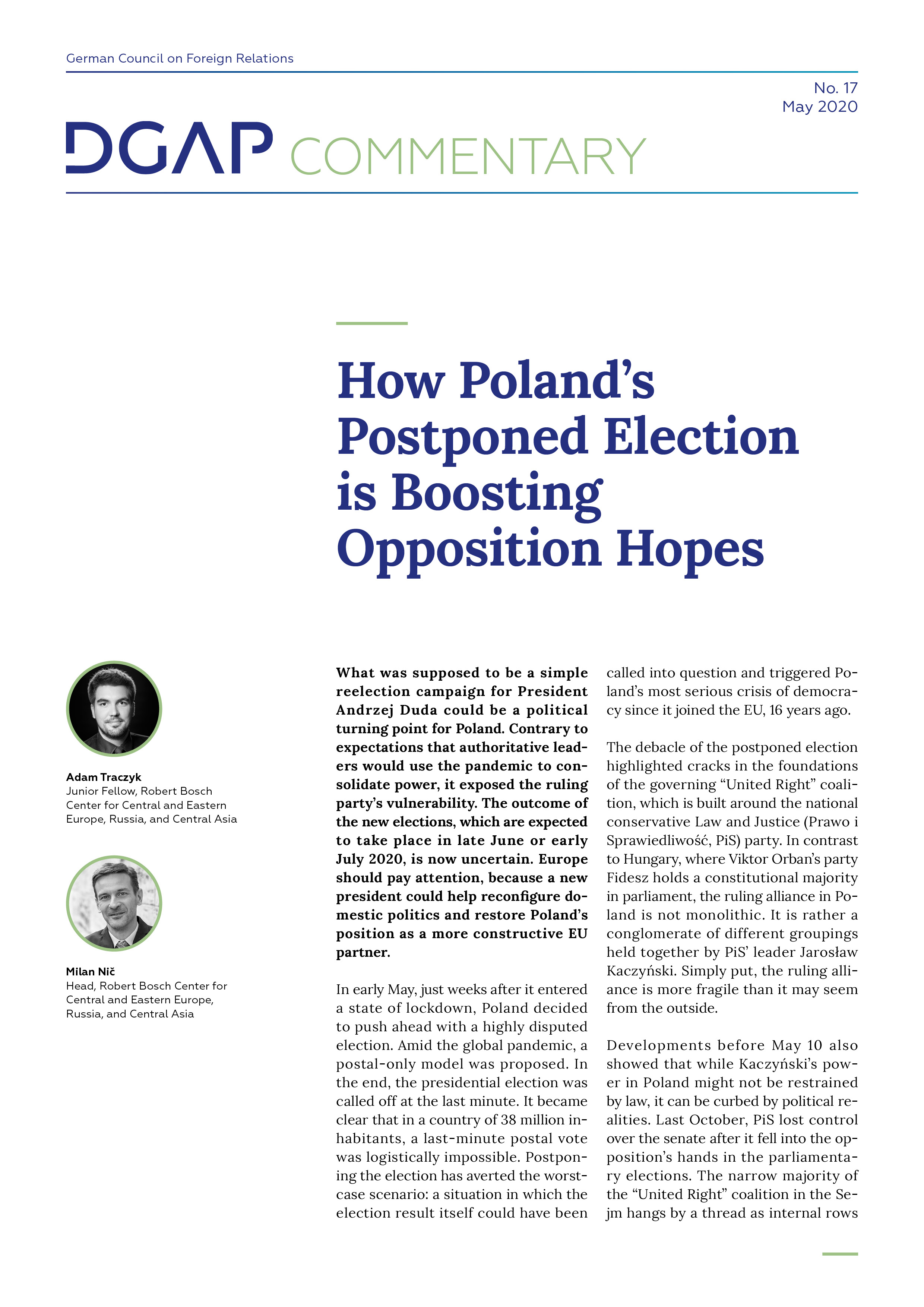 Polls conducted ahead of May 10 indicated that a significant number of opposition voters planned to boycott the election. Therefore, polls indicated that President Duda, backed by PiS, would be almost guaranteed to secure the presidency in the first round by winning more than 50 percent of the votes. More recent polls have shown that if the election were to be held in normal conditions, the current president could count on the support of slightly more than 40 percent of the voters. That still places Duda on pole position, but raises the possibility of a run-off with the leading opposition candidate. The race for the presidency is becoming more and more competitive.