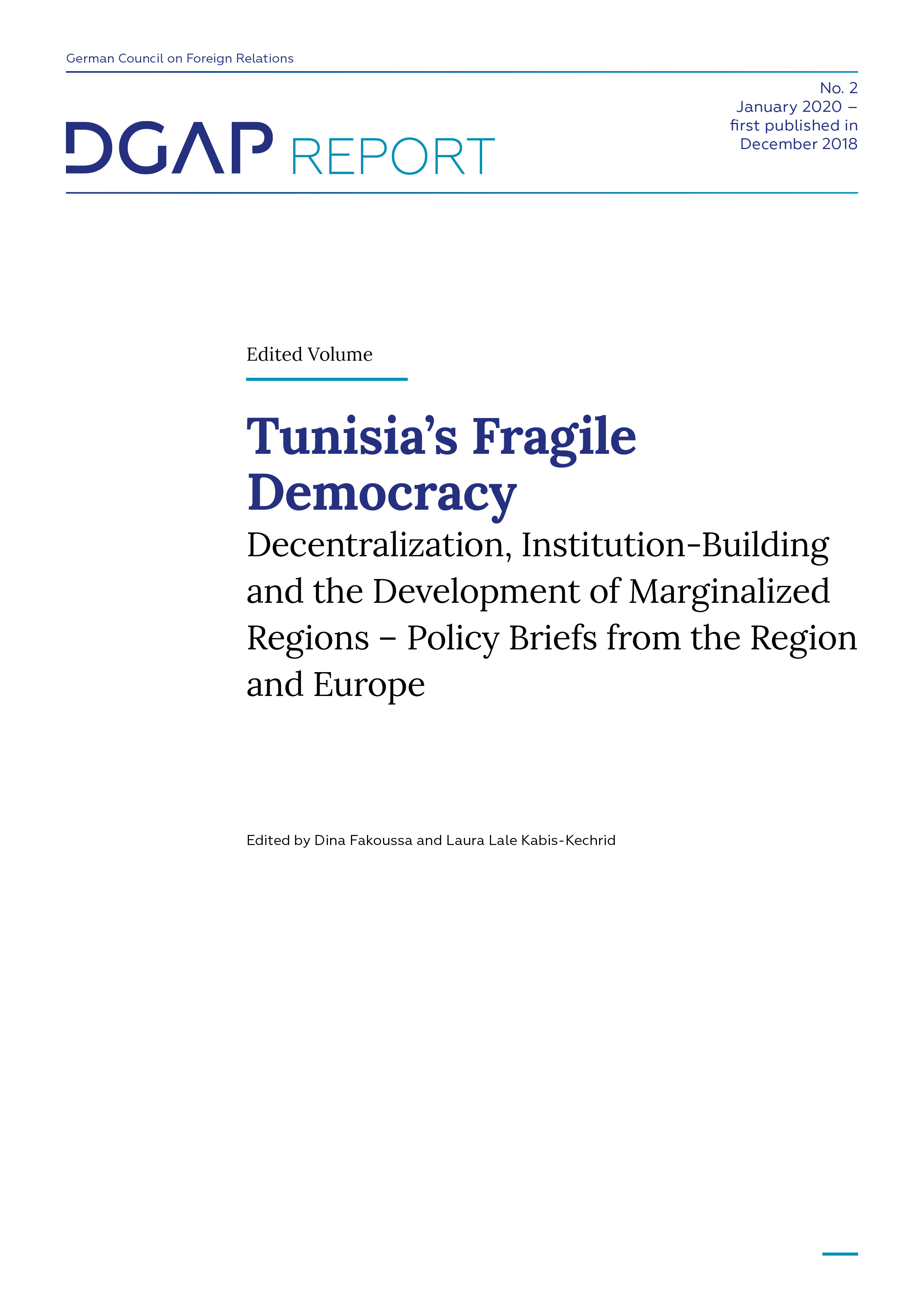This edited volume brings together papers written by the participants of the workshop “Promotion of Think Tank Work on the Development of Marginalized Regions and Institution-Building in Tunisia”. The workshop was conducted as part of DGAP’s project on strengthening think tanks and similar institutions in the Middle East and North Africa (MENA) region and Europe. The authors analyze key challenges confronting Tunisia, ranging from decentralization and institution-building to the development of marginalized regions. The volume offers recommendations for the Tunisian government as well as the EU and its member states, who have extended significant support to Tunisia to safeguard the country’s political transformation and support its economic development.