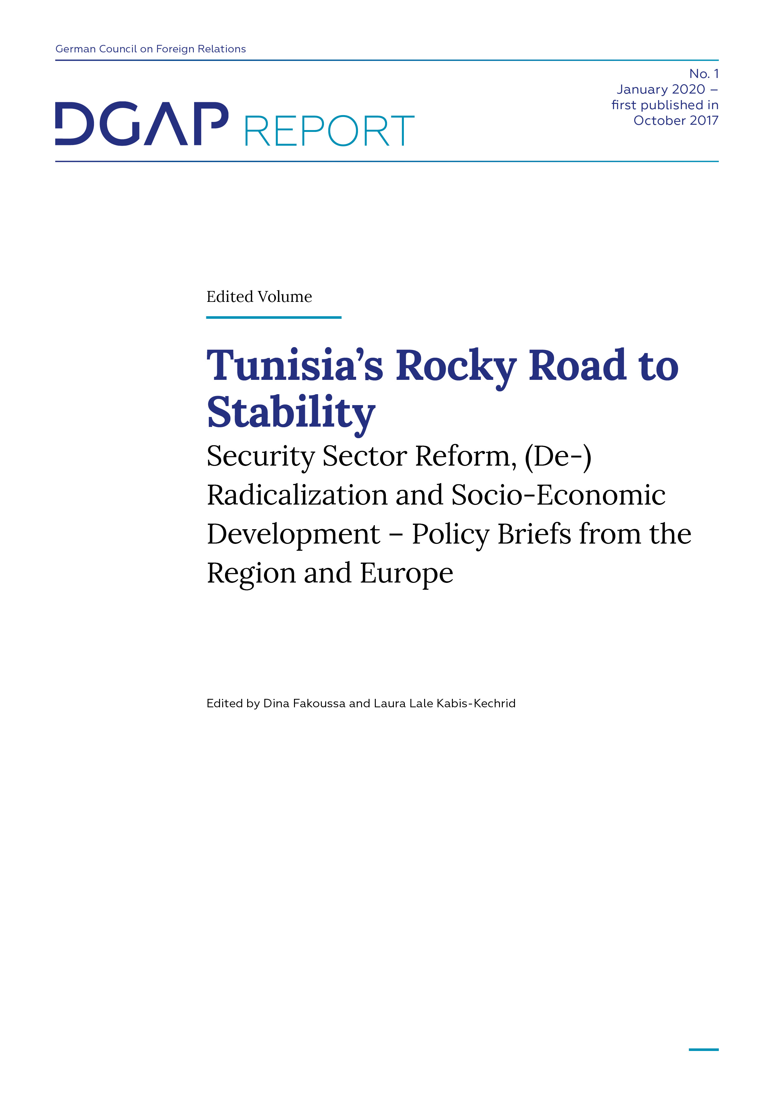 This edited volume brings together papers written by the participants in the workshop series “Promotion of Think Tank Work on Security Sector Reform and Socio-Economic Challenges in Tunisia”, held in Berlin in August and in Tunis in October 2017. The workshops were conducted as part of DGAP’s project on strengthening think tanks and similar institutions in the Middle East and North Africa (MENA) region and Europe. The authors analyze key issues impacting the political, social, and economic development of ­Tunisia, including the reform of administrative structures and the security sector, drivers of radicalization, and persisting socio-economic issues, especially in Tunisia’s historically marginalized regions. The volume offers recommendations for the ­Tunisian government as well as for the EU and its member states, who are key partners in supporting the country’s reform process.